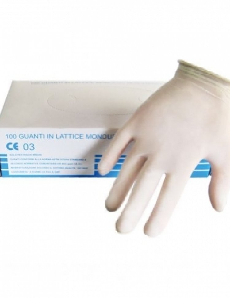 guanto monouso in lattice naturale di ottima qualita\', ambidestro, leggero ed elastico, trattamento interno con polvere antisudore CONFEZIONE: 100 PZ per pacchetto. Cartone da 10 pacchetti. Misure: TG.S, TG.M, TG.L